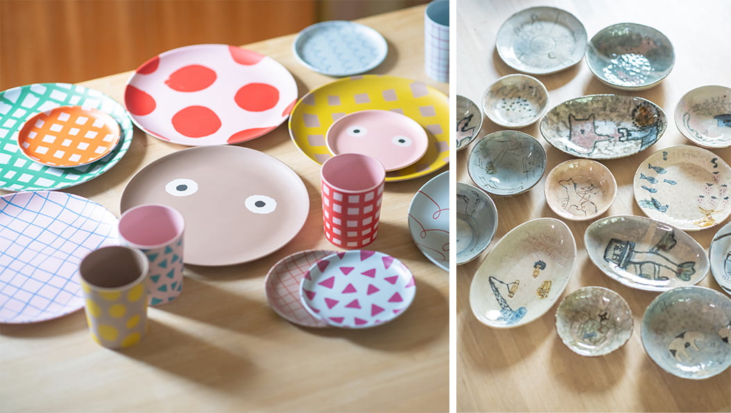 アラキさんがお気に入りと言って見せてくれたのは、どれも色や柄、フォルムなどに「クスッ」と笑ってしまうユニークさをまとったもの。写真左のカラフルな器は、gomaデザインのものです。