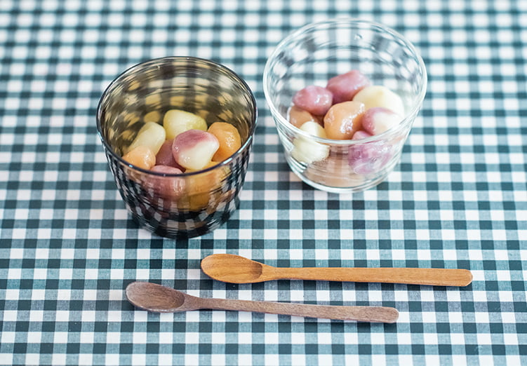 白玉をジュースで色づけした目にも楽しいデザート。ジュースの味もつくうえ、白玉をこねるだけの簡単な作業だから、子どもも楽しめます。「何色か作るとよりかわいらしくなります。アイスクリームやフルーツ、餡子を添えたり、シロップ替わりにジュースの中に入れてフルーツポンチ風にしたり、お好みでアレンジしてみてください」。
