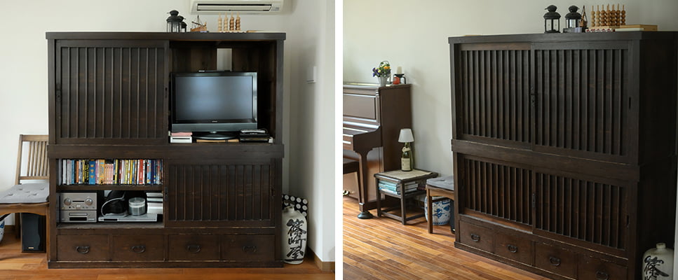 「この箪笥を見つけたときに主人がすぐ採寸し、まず、テレビが入ることを確認して購入したんです。主人の実家でもテレビを隠す家具をあつらえていたんですよ」とペレさん。配線のために背板は一枚はずしてアレンジし、テレビ以外にも、雑然とした印象になりがちな生活用品を収めているので、引き戸を開閉したときの印象の違いは歴然です。