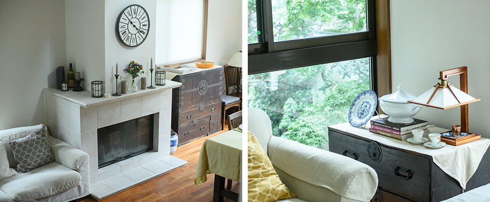 また、季節感を意識した演出はペレさんのこだわり。「暖炉や和箪笥の上を季節の小物を飾るコーナーとしています」。ひな人形など行事ごとの装飾だけでなく、キャンドルやクッションカバー、壁面に飾る絵画も色づかいを意識して季節ごとに交換するそうです。