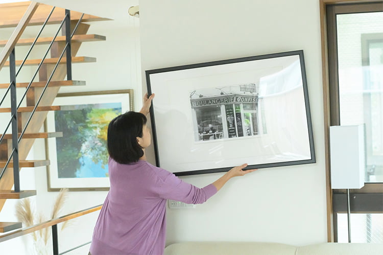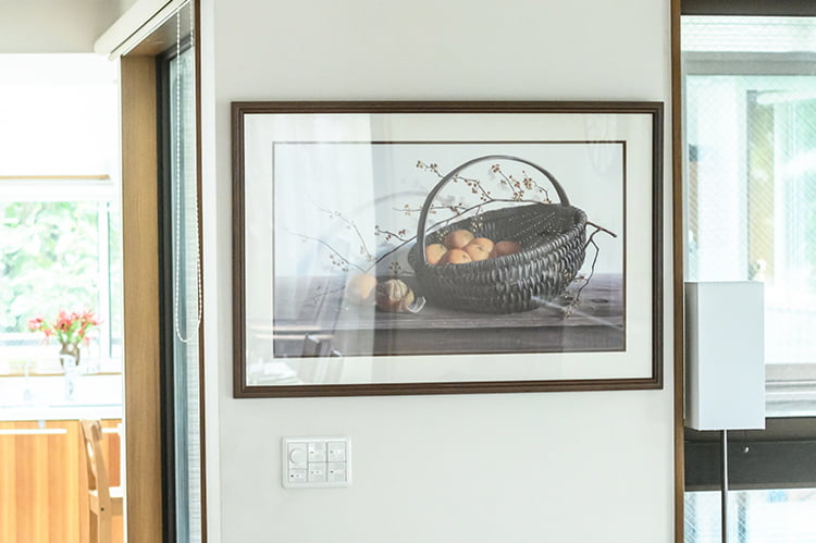 「欧米では、真っ白な壁はあまり見ません。皆思い思いに飾っているんですよ」。ペレさんがソファ近くの壁に常時飾っているのは絵画。この日は秋冬に向けて、涼しげなモノクロの絵画から実とカゴが描かれた暖色系のものにチェンジ。この絵はご主人の仕事の都合でアメリカに暮らしたとき、借りていた家に飾ってあったものを譲ってもらったという思い出の品。