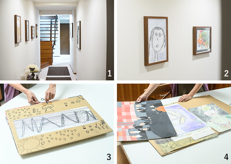 - 敷地と間取りの都合上長くとった1階の廊下を生かせるように「ギャラリーにして楽しく彩ろう」と考えたそう。3人のお子さんがこれまでに描いた作品専用のコーナーとし、季節に合う色味を選ぶなど、定期的に入れ替えています。