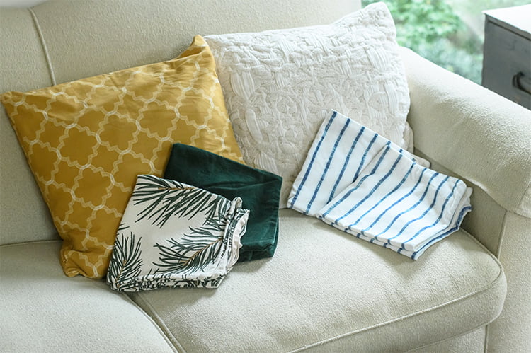 四季の移ろいをインテリアにも取り入れるよう心がけているペレさん。色や柄、素材感で季節感を印象づけられるファブリックはとても便利で、特に気軽に交換できるクッションカバーはお気に入り。白×ブルーのさわやかなストライプ柄は夏に、深いグリーンや針葉樹を思わせる葉の柄はクリスマスシーズンを盛り上げるのに愛用しています。