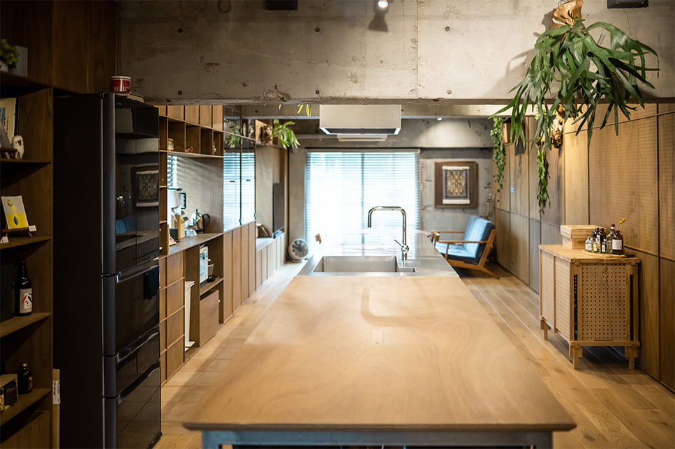 玄関を入ると奥まで見渡せるひと続きのスペースになっているLDK。中心には、オープンカウンターの広いアイランド型の造作キッチンがあります。リノベーションの計画をスタートした当初は、スタンダードなプランをイメージしていたため、建築家からこの大胆なプランを提案された時は驚いたそうですが、すぐに気に入ったとか。