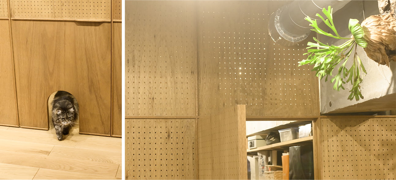また、愛猫「花火」にとって暮らしやすい空間にするのも、リノベーションの課題のひとつ。窓際に居心地のよいベンチを設置したり、猫専用の出入り口を設けたことで、入居後も快適に過ごしているとか。2020年の春からはもう1匹の猫「煙丸」が家族に加わり、さらににぎやかになりました。
