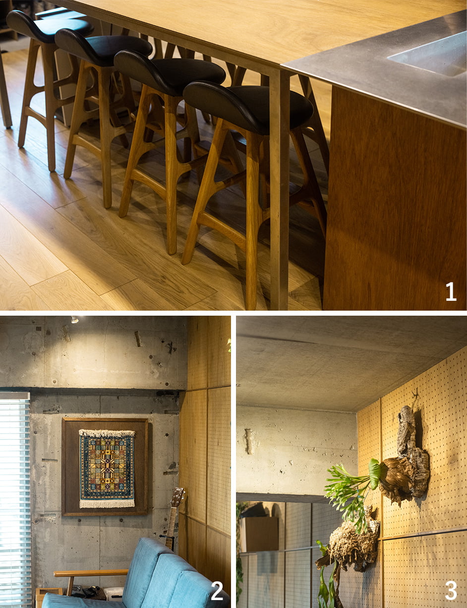 - キッチンカウンターとワークテーブルは、豪希さんが作業しやすい90cmに設定。ワークテーブルには北欧デザインのカウンタースツールを選びましたが、テーブルの高さに合わせて8脚の脚をカットしたとか。