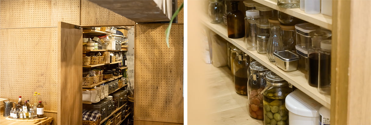 一見、壁面のように見える扉を開けると現れるのがパントリー。室内の両サイドに棚を設け、たっぷり収納を確保しました。食材のストックはもちろん、豪希さん手作りの梅酒やびわ酒、塩レモン、塩金柑などのびんがずらりと並びます。「この空間は、僕たちの実験室みたいなものかな」と豪希さん。ここではいつも手作りの発酵食品や果実酒の熟成が進んでいます。