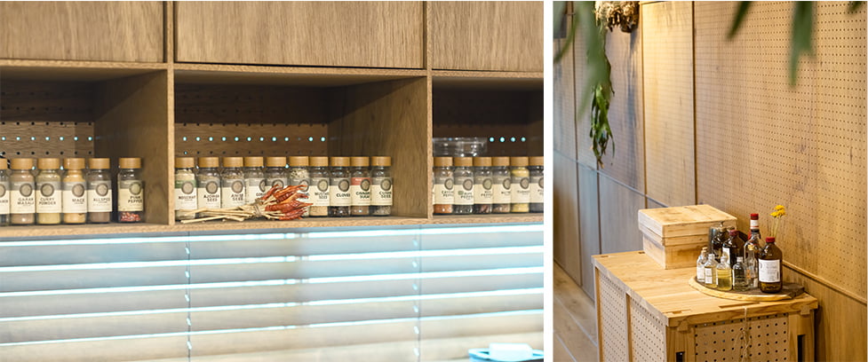 壁面収納の棚には、お気に入りの器を見せながら収納。いつも使う調味料やスパイスは、手に取りやすいようオープン棚に並べています。「おいしくて、値段のバランスがよくて、パッケージがかわいい」という点でセレクトしたスパイスのボトルがずらりと棚に並び、インテリアの一部になっています。