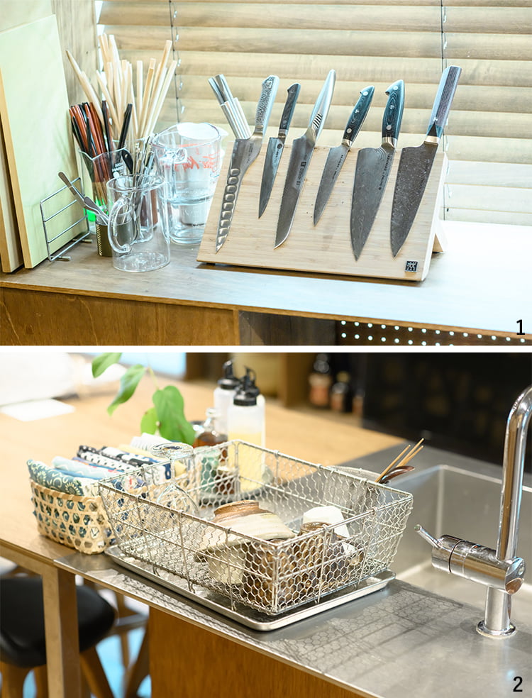 - 「何品も同時に調理するから、ナイフはすぐに手が届くところに何本か用意しておきたいんですよね」と豪希さん。マグネットでとめることができるナイフホルダーはドイツ製。常時6本をここに収納しています。