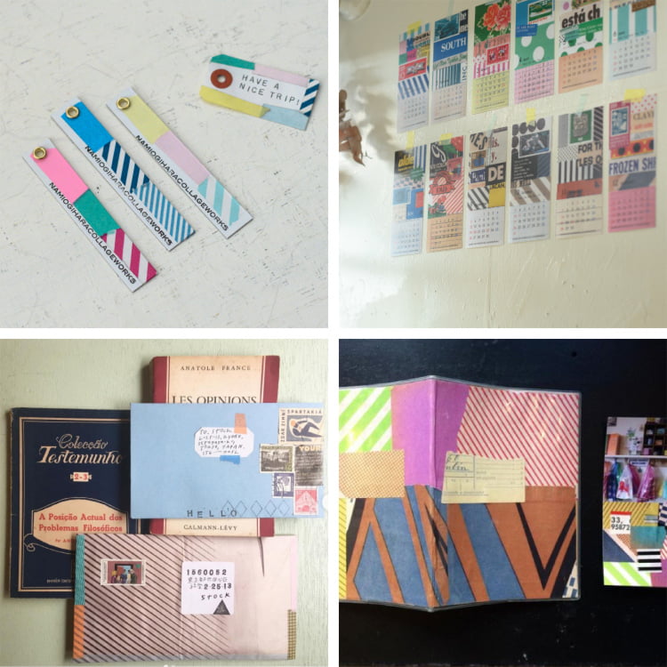 親しい人に送る書簡や手帳カバー、さらにはラッピングなど、オギハラさんの身の回りの品には、随所にコラージュの技が生かされています。なかには、コラージュの作品を柄として取り入れて作った一筆箋やカレンダー、包装紙も。
