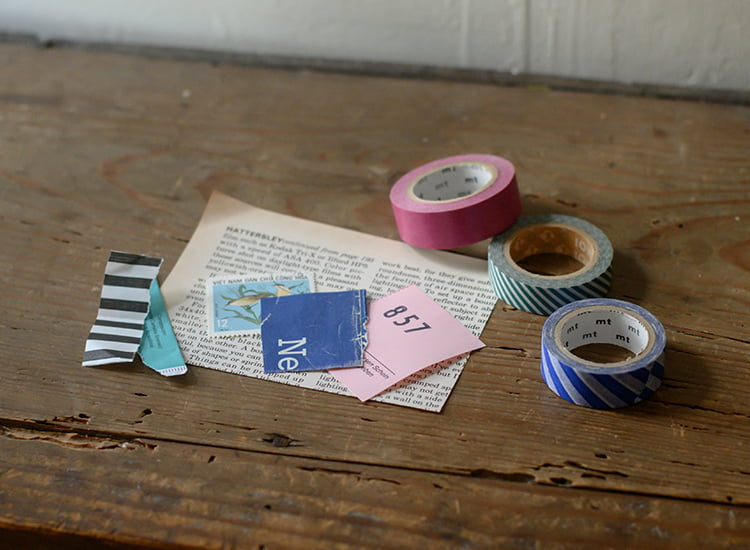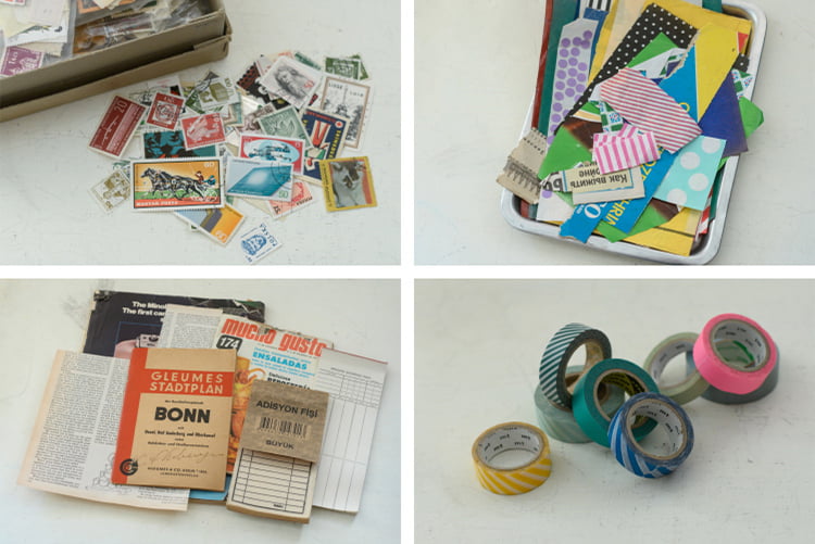 「包装紙の余りのほか、商品パッケージにあるかわいいロゴを切り取っておいたり、シールや外国の切手をアクセント用に集めています。外国語の伝票なんかも、味わいがあってお気に入りの素材ですね」。