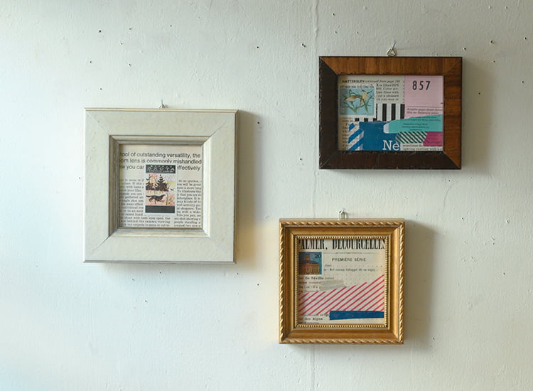 フレームを飾るとき、中に何を入れようか迷うことはありませんか? アートや写真だけでなく、オギハラさんは、フレームの色やデザインに合わせてコラージュを作るそう。ここでは、ダークブラウンのフレームに収めるコラージュを例に、レイアウトのコツを伺いました。