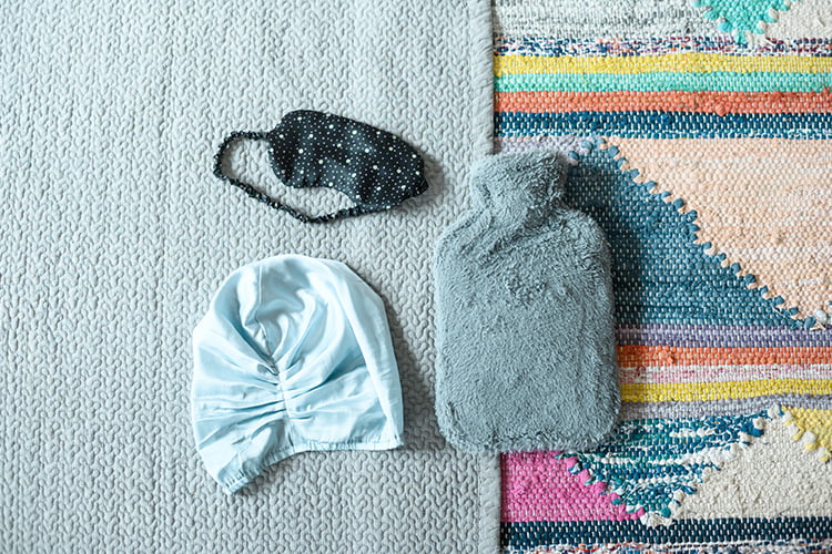 また、冬のベッドには湯たんぽをセットして足元をほかほかに。肌ざわりのいいナイトキャップやアイマスク、ベッドリネンなど、就寝時に身につけるものも楽しんでいるそうです。時には、携帯電話を別の部屋に置き、快眠の環境を整えることも。