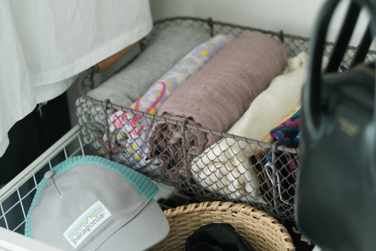 ストールなどの巻き物や帽子など季節感のあるファッション小物は、カゴにまとめるのが柳沢さんの基本収納。オープンなので取り出しやすいし、衣替えのときもオンシーズンの同アイテムをすっぽり入れ替えるだけなので簡単です。