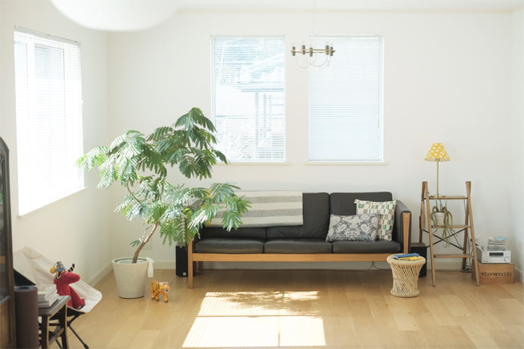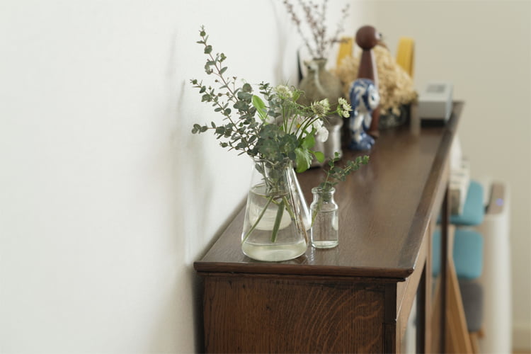 インテリアの衣替えも、柳沢さんの定番は簡潔。「収納場所をとる布物はポイントを絞って衣替えします」と柳沢さん。メインはクッションカバーと家での仕事で一年中マストなひざかけです。年2回替えて、ほんのり季節感をリセット。スリッパはオールシーズン使える素材を選び、冬は厚手のソックスを活用するなどして調整します。これで、場所も時間もコンパクトに。その分、最近は季節の花のサブスクリプションを利用して季節の彩りを楽しんでいるそうです。