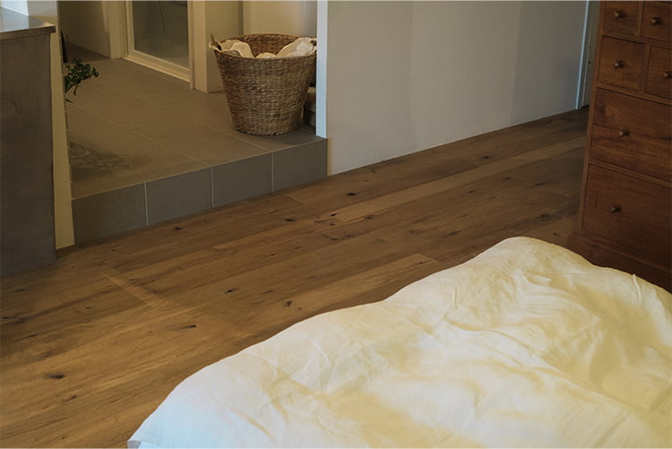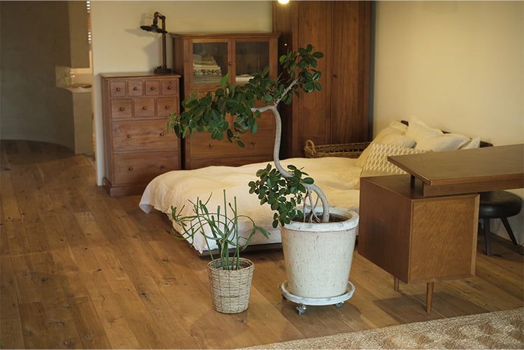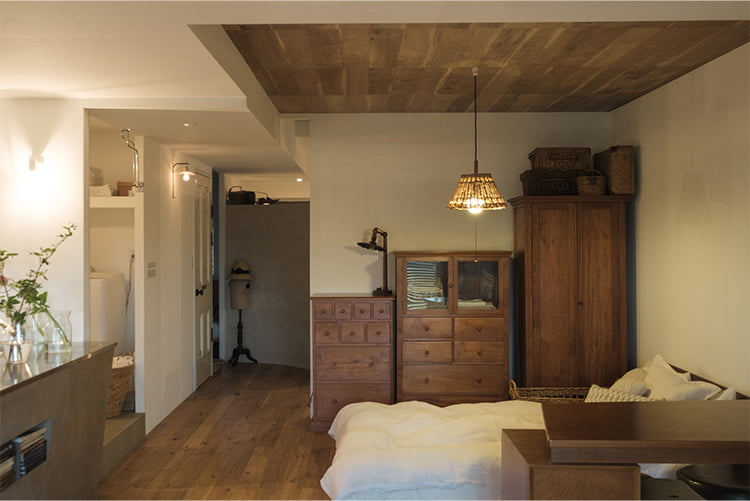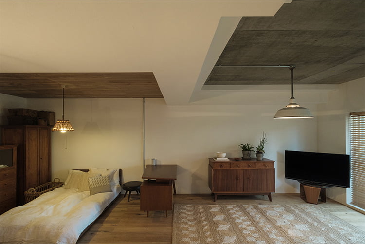 ひと部屋は、衣類や生活用品をおさめるほか、独立した息子さんが来たときの寝室として備え、基本的な生活は全てLDKで。仕切りはありませんが、天井の高さや素材、家具を使ったゾーニング(空間を用途別にエリア分けすること)でそれぞれのコーナーが構成されています。