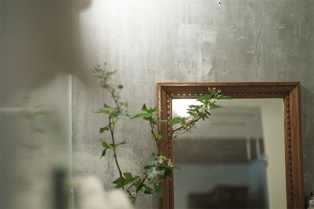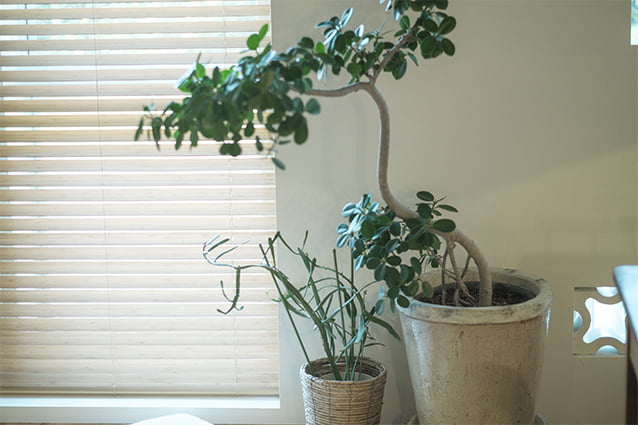 「花よりもグリーンが好きですね。空間に動きを加えたり、光を受けて白い壁に形良いシルエットを映し出すような枝ぶりの苗を選んで、インテリアとの相乗効果が出るように意識しています」。