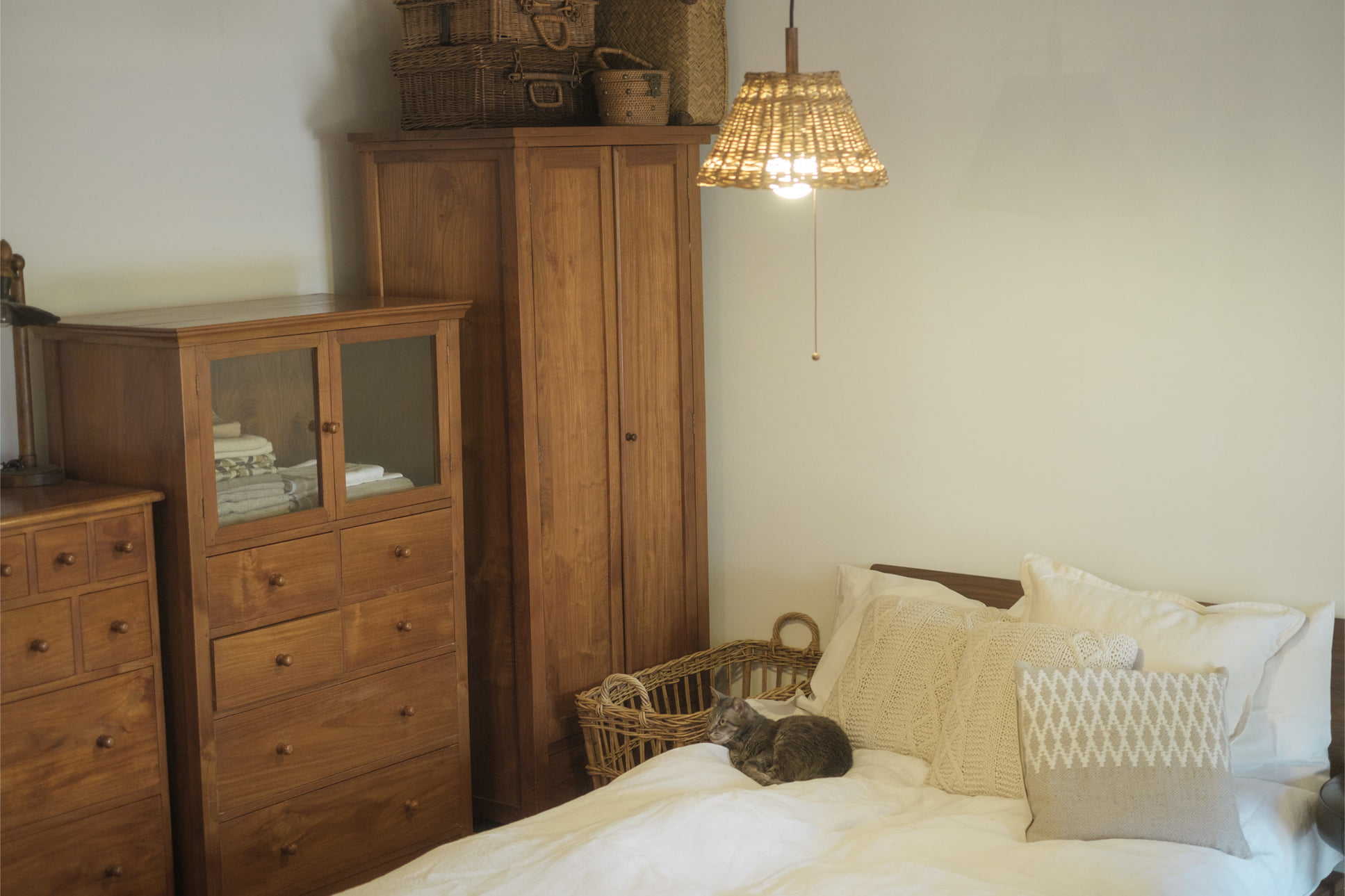 この家具の色や雰囲気に合わせて、アンティークのバスケットや照明、北欧のサイドボード、イギリスのダイニングテーブルをセレクト。それぞれの国や素材は違いますが、どれも少し赤みのある木肌の家具で、しっくりなじんでいます。