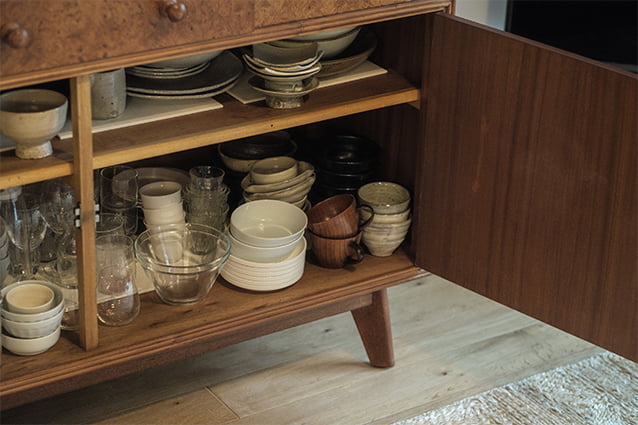 「だから、一見飾っているだけのように見えても、すべて実用品。キッチンでは調理器具を見せる収納にしているので、空間になじむように色味を統一するように気をつけています」。