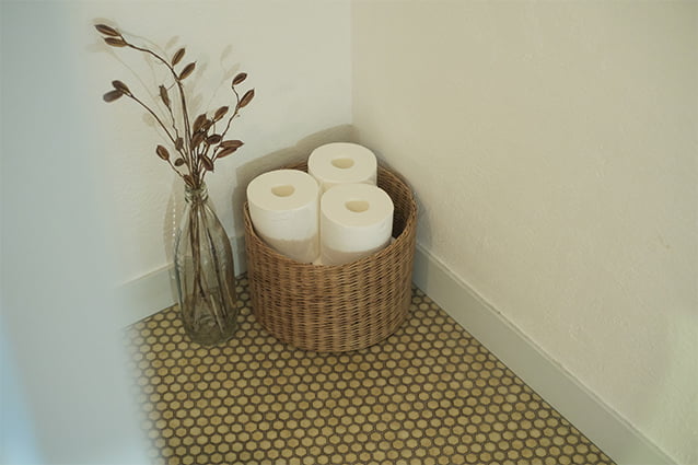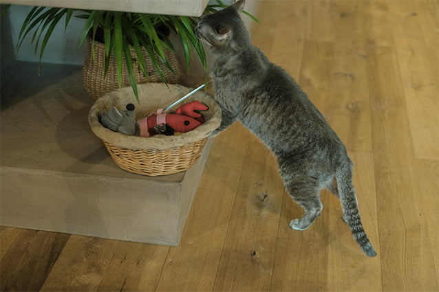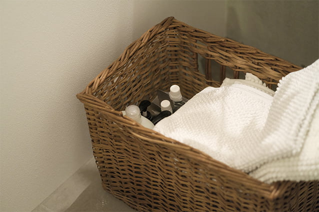 食器やベッドリネンなどはLDKに置いた家具にそれぞれ収納していますが、消耗品のストックや猫のおもちゃ、スリッパなど出し入れのしやすさを優先したいモノには、バスケットや木箱が活躍。バスケットは昔から好きなアイテムなのでたくさん持っていて、ディスプレイ感覚で実用できるので重宝します。