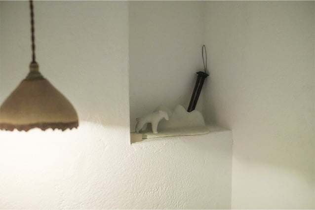 また、家具の上やニッチ(壁面などに設けた凹み)など、動線を遮らない場所を活用することで、広い空間をキープ。1LDKの大胆な間取りを生かす工夫は、ディスプレイ面でも配慮しています。