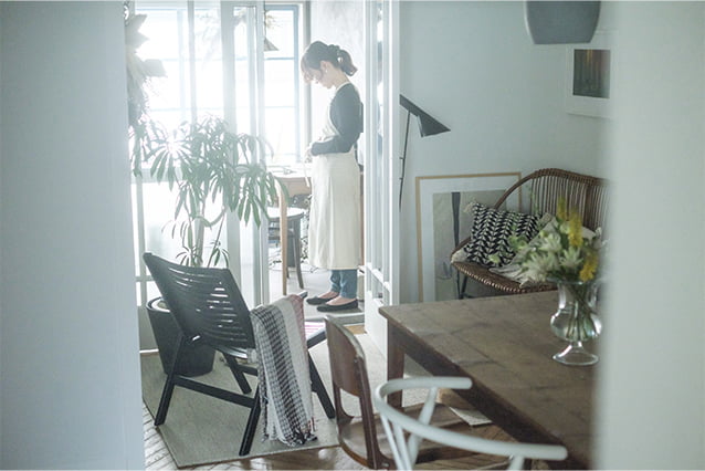 店舗兼アトリエに続くリビングのガラス戸を開け、エプロンを手に取るHarunaさん。キュッとウエストを締めれば仕事モードです。また、主に窪田さんが使う2階のスタジオは、リビングダイニングから階段を上がると広がるオープンな空間。ちょっとした行動で場面転換がはかれるので、プライベートから仕事へスムーズに気持ちも切り替わります。