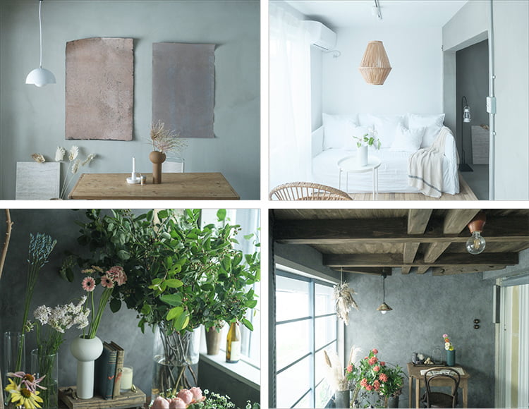 たとえば2階のスタジオ(左の写真上段)は、ビビッドな雑貨や植物の色がよく映えるグレーのモルタルやさわやかな白の壁を採用、1階のHarunaさんの店舗兼アトリエ(左の写真下段)は花色やグリーンと美しいコントラストを奏でる色ムラのあるグレーを基調に。どちらも、インスピレーションを刺激してくれる背景です。