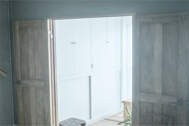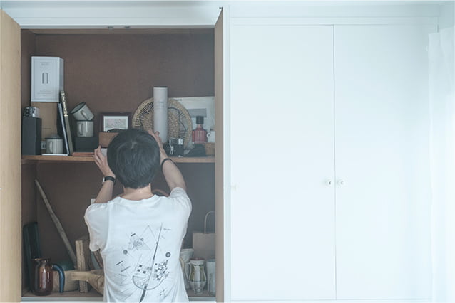 もともとついていた押し入れを生かした、撮影小物や道具類の収納場所。奥行、間口の広さは昔ながらの押し入れならでは。扉を白くペイントしたので、現在のスタイルにもよくなじんでいます。