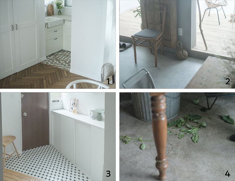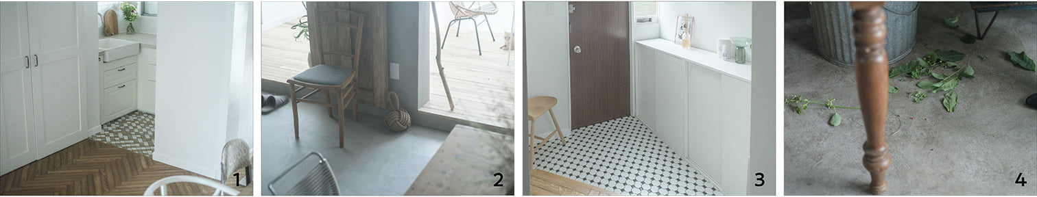 キッチンはランタンタイルですが、茶色を取り入れることでフローリングとなじみよくしています。 - スタジオはモルタルとフローリングの2種をセレクト。フローリングはアメリカのローラースケート場で使われていたヴィンテージの素材を採用しました。