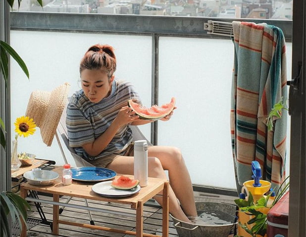 「仕事や食事を外でしてみることですね。テーブルの準備とか大げさな準備なんて必要なくて、ラグやクッションとパソコンをベランダに持ち出す程度のラフなスタイルで十分。それだけでリフレッシュになります」。