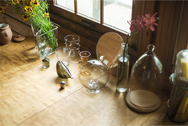 天井の高さを生かして、念願だった大きな照明でインパクトを出したほか、ご主人が選んだ北欧の家具、お気に入りのラグで仕立てたタペストリー、ガラス雑貨、郷土玩具など、さまざまなスタイルのお気に入りアイテムをみごとに調和させ、日常の暮らしに特別感を装っています。