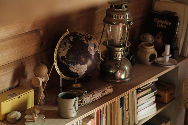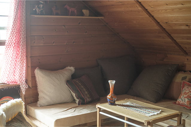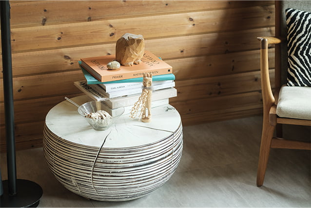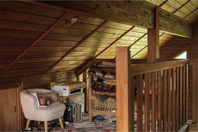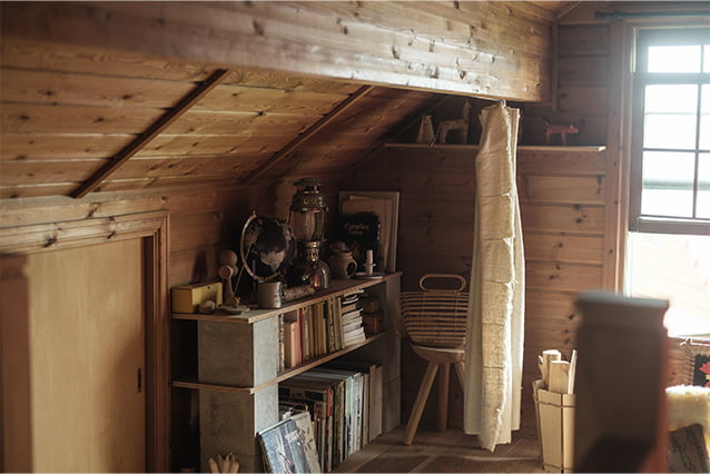 「屋根裏部屋っていうだけでワクワクしませんか?」とYURIEさん。このログハウスの特長的な空間でもある屋根裏部屋は、物件を見たときから気に入って「映画を観たり本を読んだりしよう」と趣味の籠り部屋をイメージ。天井の高さに合わせてDIYしたローソファーを配置して、プロジェクター用にカーテンをサッと引くだけのスクリーンを用意したり、本棚を設えたり……。また、周囲には旅先で手に入れた品を飾るなどして、YURIEさんの“好き”を集めた部屋にしました。