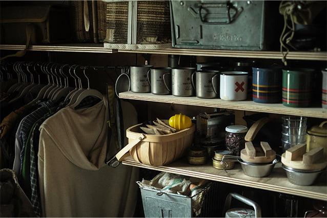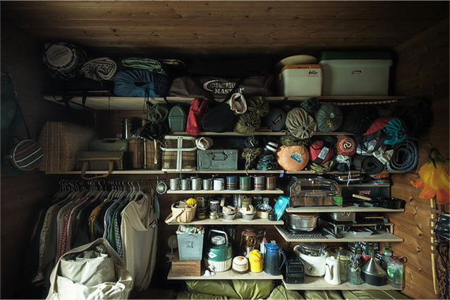 一方、1階の4畳半ほどの部屋は、アウトドアツールの収納に徹しています。実用重視ですが、こだわって集めたツールの数々が特注のオープン棚に一覧でき、旅への期待感を搔き立てる空間です。