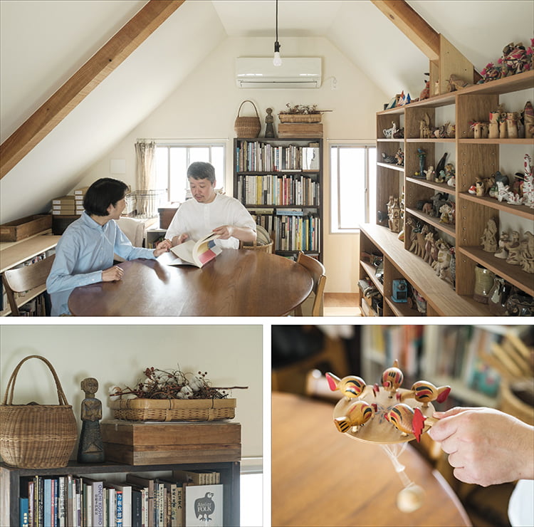 東京・中野区の戸建て住宅にて、住まい兼オープンアトリエを展開するYUYAさんとスパロウ圭子さん。5年前にこの物件を内覧した時、三角屋根の形が印象的なロフトを見て、郷土玩具など民芸のコレクションを飾ることをイメージしたそうです。