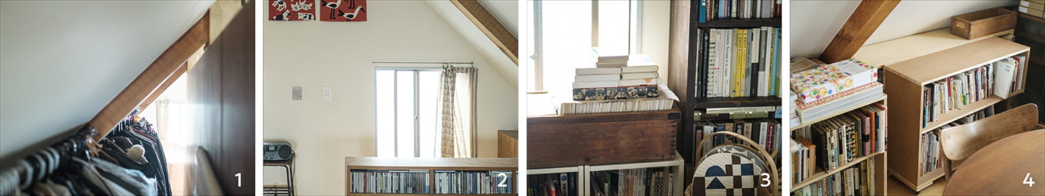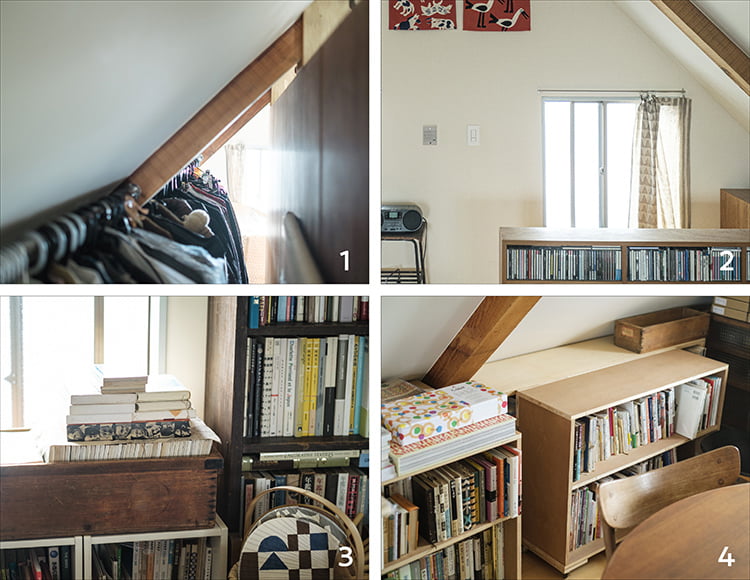 趣味部屋としているロフトですが、実は季節外の衣類や使用頻度の少ないモノを置く納戸の役割も果たしています。ここでも、限られた空間を有効に使う工夫が凝らされ、モノが多くてもすっきり見せています。