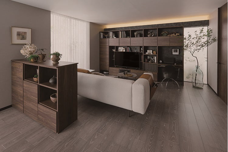 「例えるなら、多用途に使える公民館のイメージ。最初から空間をはっきり区切らなくても、スペースが必要になった時に生み出せるような間取りにしておくというアイディアです。先々、家族構成などに変化があった時にも対応しやすいですよね。パナソニックの『キュビオス』のように、間仕切りとしても使えて、組み替えもできる収納システムを使うのもおすすめ。デスクコーナーを設けて、必要な時に作業スペースを創出するなど、自由なプランニングができます」。