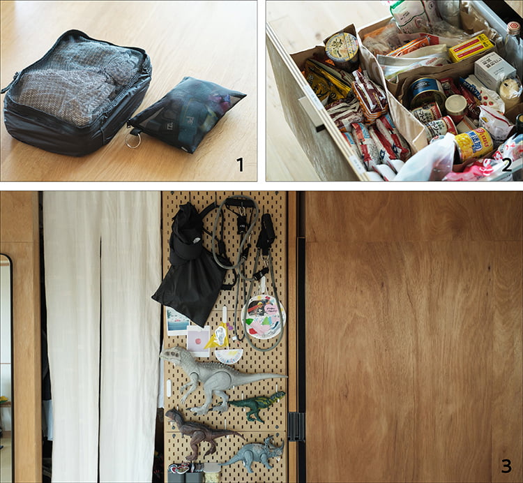 - 右はアウトドアで使うヘッドライトをメッシュのポーチに入れたもの。中身が見えるので存在を忘れない。左はシーズンオフの衣類。