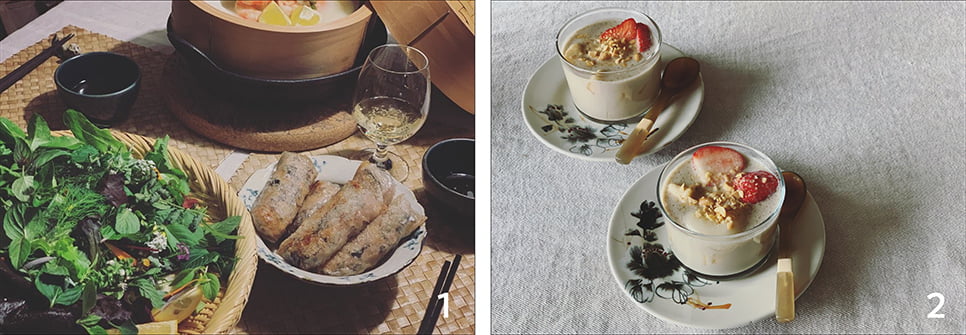 - 安南焼きの器に盛った揚げ春巻きに、ザルいっぱいのハーブを合わせた瑞々しい演出。料理と器で異国感を楽しんで。