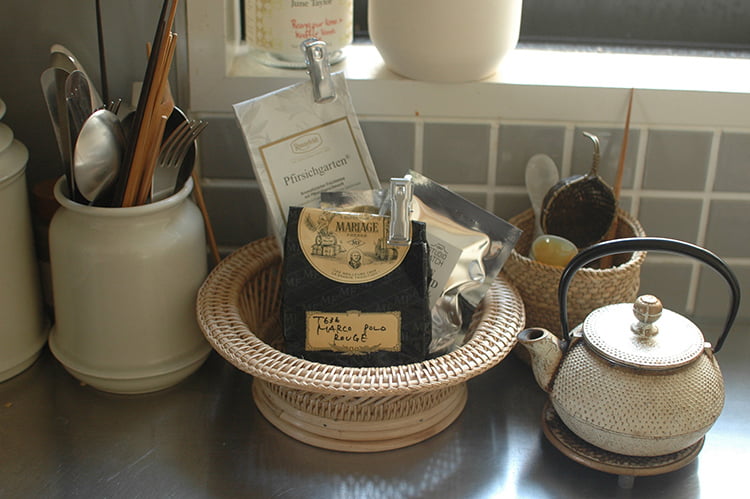 お茶が大好きで、毎日さまざまな種類を楽しむ大谷さん。茶葉やお茶の道具類は、カゴにまとめてキッチンにセッティング。頻繁に飲むお茶は、簡単にクリップで留めています。