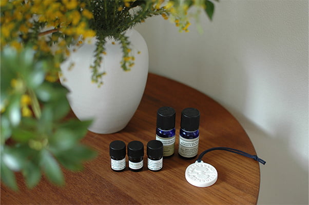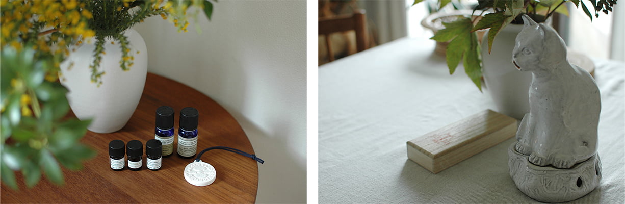 花と同様に、暮らしの中で癒しアイテムとして利用してきたのが、アロマオイルやお香類。お子さんが小さい今は控えているものの、日々のさまざまなシーンで使い分けているそうです。