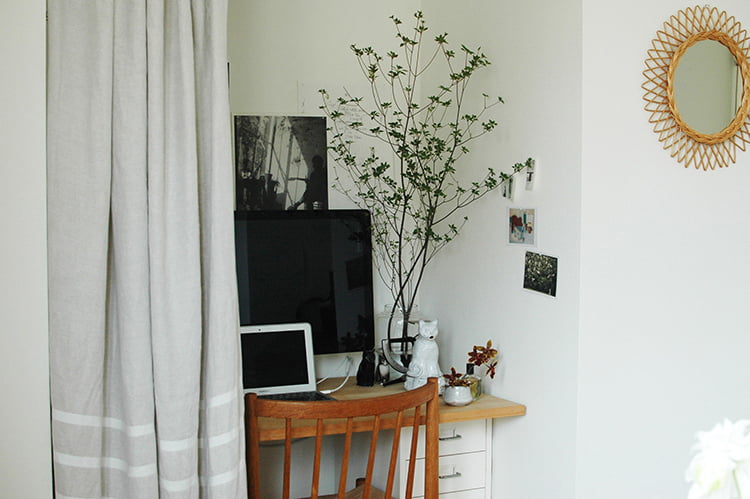 持ち物の見直しの次に手を加えたのは、家具のレイアウト。特に変化があったのはワークスペースの捻出でした。ご主人のリモートワークが増えたことから、隣接していた2人のデスクを分け、集中しやすい環境に変更。大谷さんのデスクは収納スペースにしていた部分に移動したそう。入口をカーテンで仕切ることで、使わないときは視界に入らないようにしています。