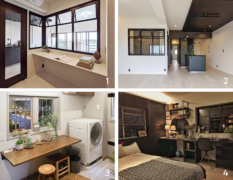 - 1・2 LDKと隣接するように、ワークスペースを設えたリノベーション物件。静寂さをキープしながらも、室内窓を通して双方の様子が見られるのがメリットです。