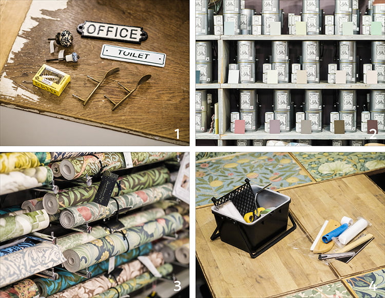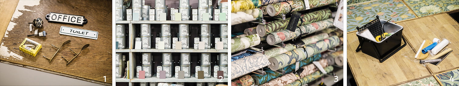 - 4 DIYを始めるなら、過不足なく道具類を揃えることも重要。坂田さんのお店では必要なアイテムをセットで販売しています。左はペイント用ツールセット(バケツ、ローラー、刷毛、マスキングテープなど)、右は壁紙用ツールセット(竹べら、ローラー、カッターナイフなど)。