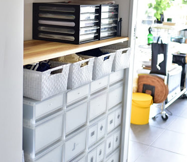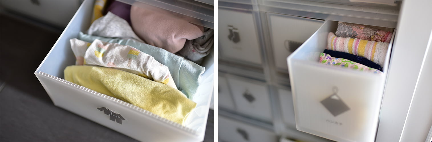 現在12歳の双子のお子さん用の衣類収納。ジャンル別に仕分けしやすいよう、引き出しにイラストで記しているのがポイント。文字で記すよりもパッとひと目で認識できるので、お片付けのハードルが低くなります。また、引き出しを置いたのは洗濯機からも脱衣場からも近い洗面スペースなので、出し入れの動作がスムーズ。「保育園児だった時から、ずっとこの方法で収納しています」。