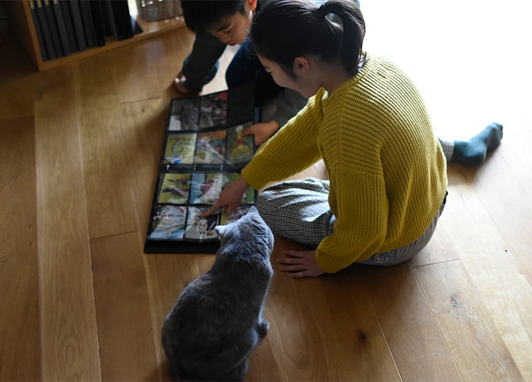 例えば、気づくと膨大な量になって整理に困る画像データ。特に、子どもの写真は多くなりがちなうえ、スマホやデジカメ、もらった画像など、出どころもさまざまです。Emiさんの整理法は、毎月アルバムの見開きを埋める11枚だけをプリントして入れ込むというもの。データはDVDに焼いてアルバムと合わせて保管し、それ以外のものは外付けのハードディスクに収納。アルバムはいつでも家族やゲストが眺めて楽しめるようにリビングに置いています。