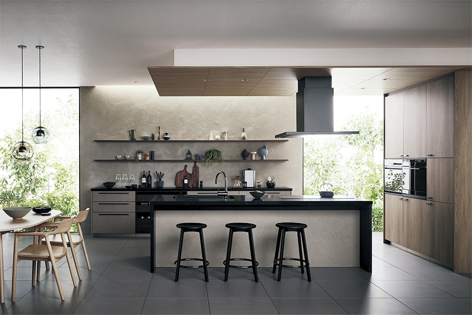 「近年ではオープンキッチンが増えてきました。LDKでもかなり存在感があるので、面材の色と壁の色の関係に配慮が必要です。真っ白のキッチンは人気が高く、取り入れている家庭も多いと思いますが、その周囲を色壁にしたい場合は、黄味がかった白やグレージュなどの明るいニュアンスカラーがなじみやすくておすすめ。逆に、キッチン本体がグレーやベージュといったニュアンスカラーの場合は、色相さえ揃えれば大胆な壁色も違和感なく楽しめますよ」。