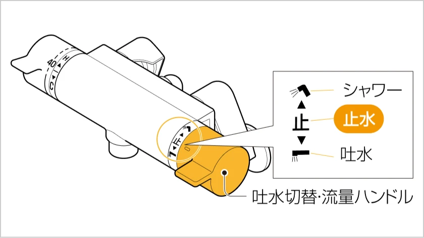 吐水切替・流量ハンドルの止水位置を「止」に合わせてください。