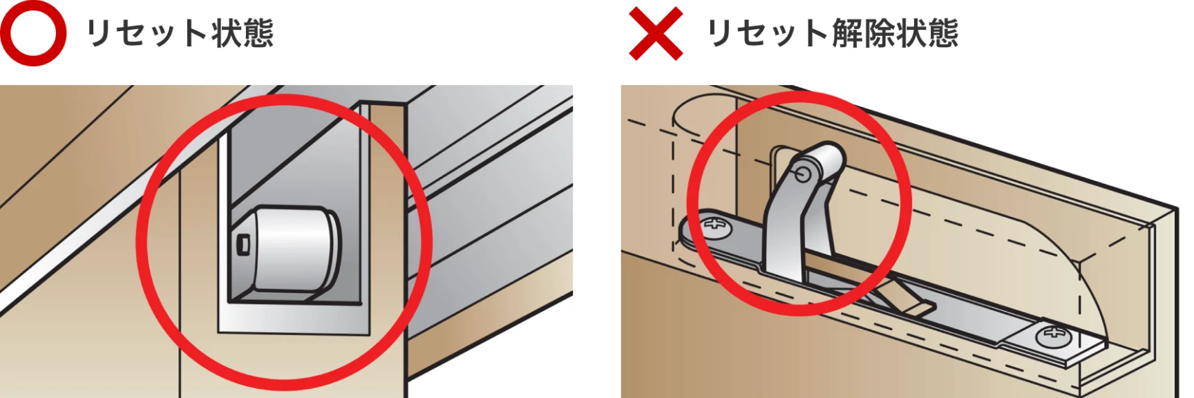 リセット解除状態だとソフトクローズが作動せず、引戸が閉まらなくなります。また、リセット解除状態の場合、引戸ソフトクローズ受け部材も損傷しているので交換が必要です。
