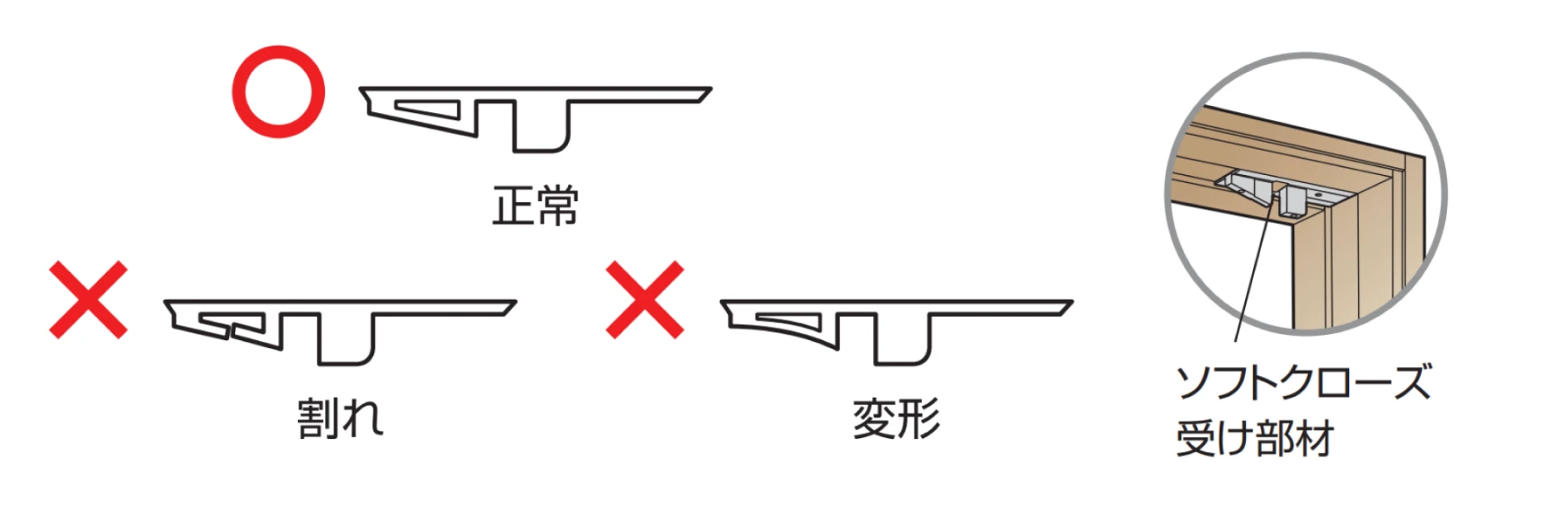 受け部材が割れたり、変形しているとソフトクローズが上手く作動しなくなります。