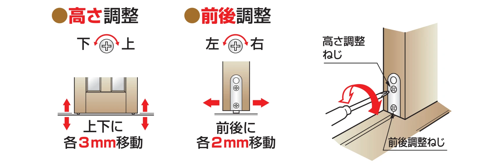 調整する時は、手回しドライバーを使用し、電動ドライバーは使用しない